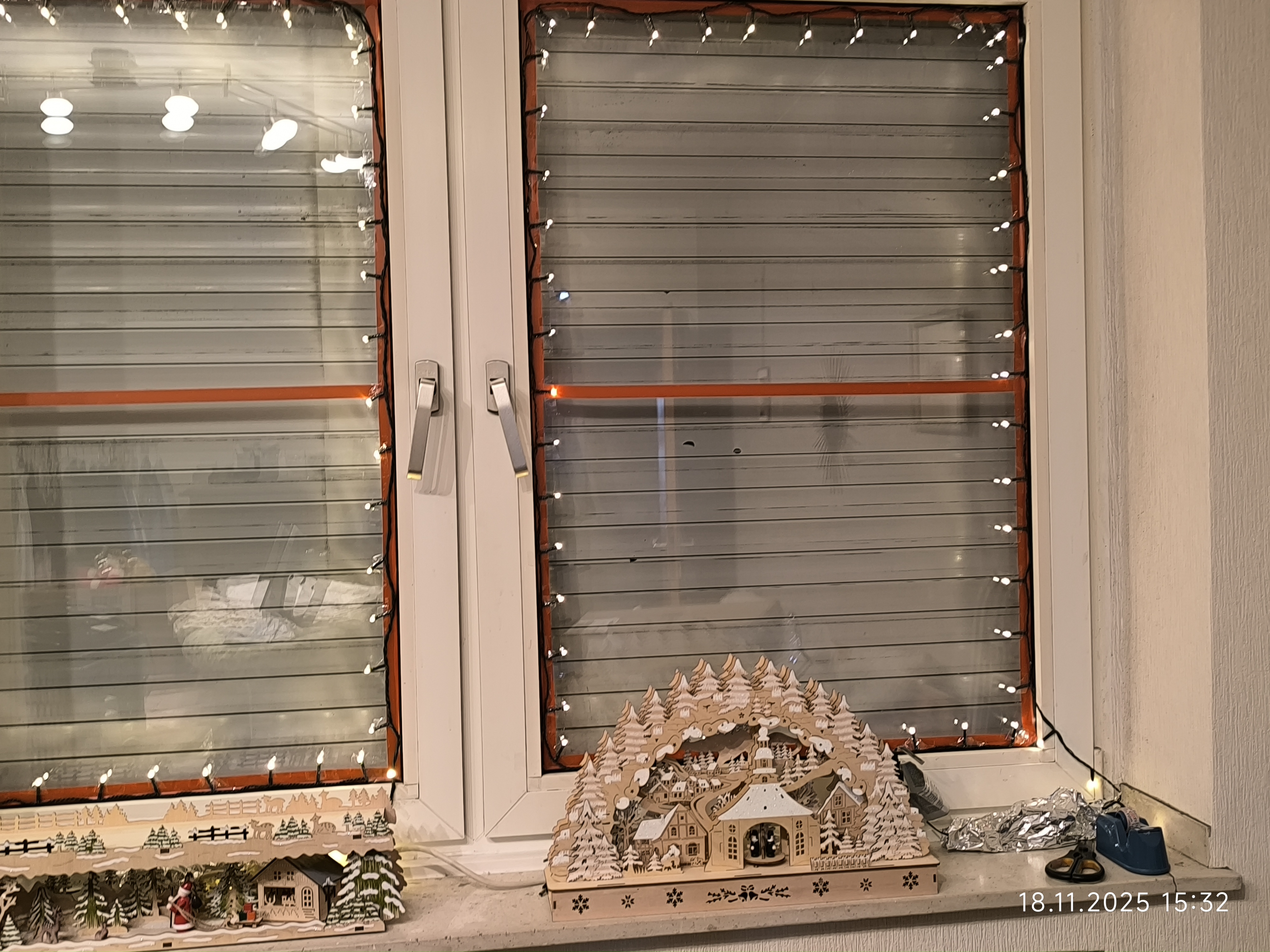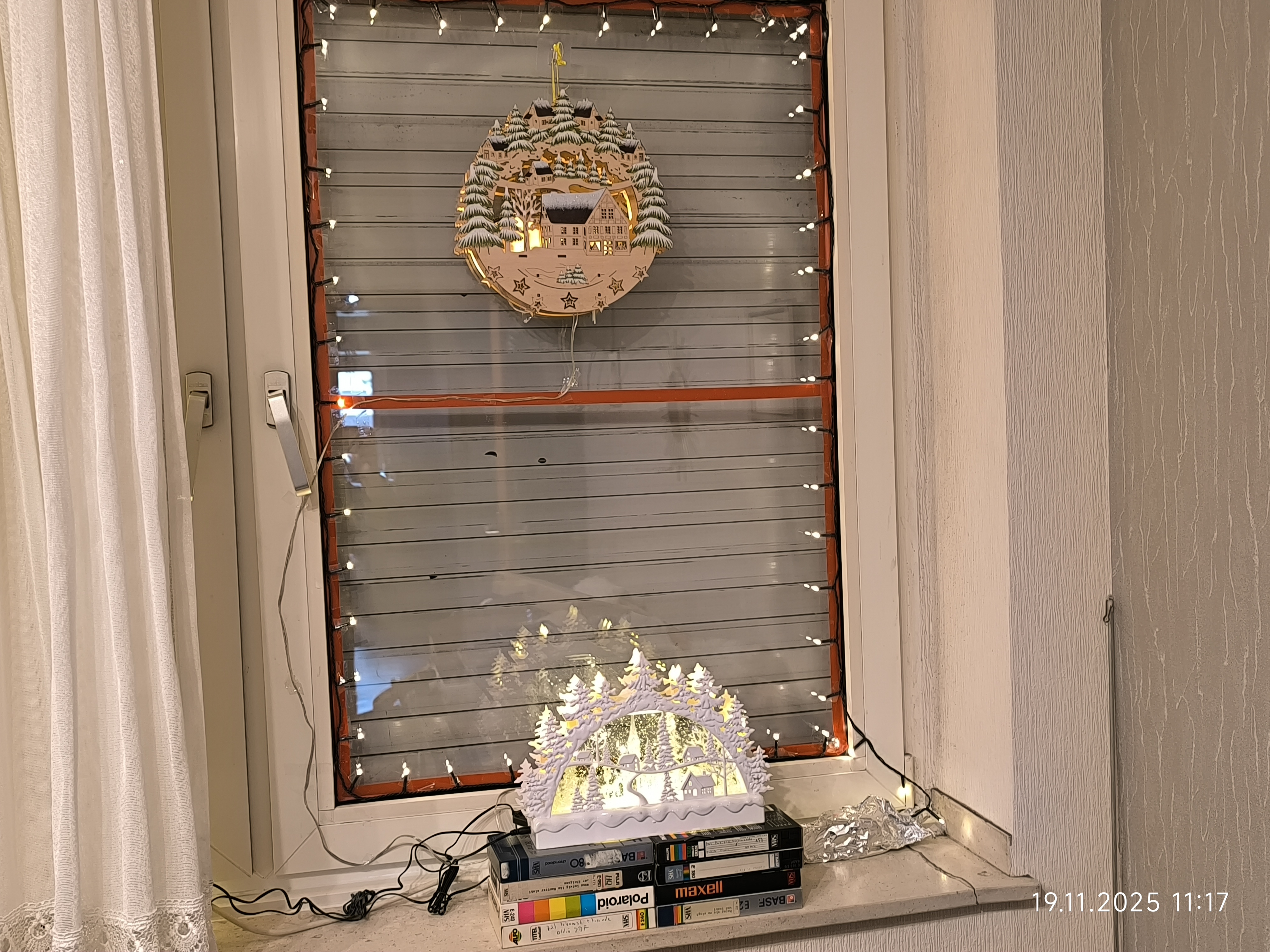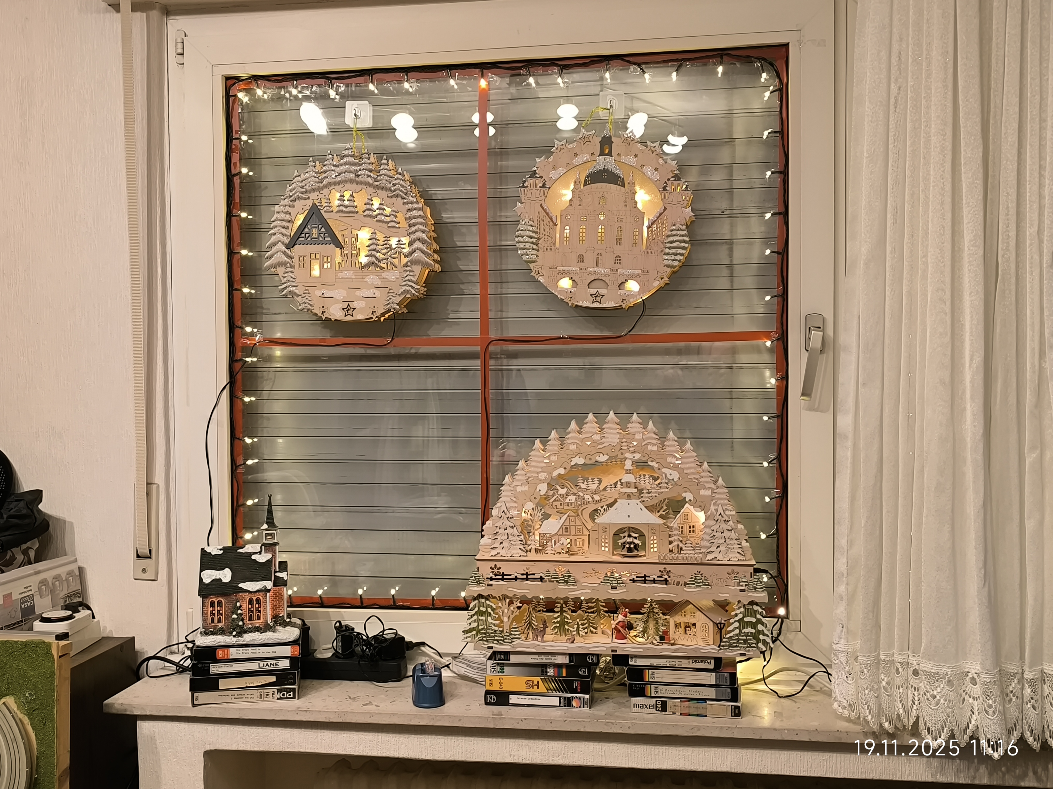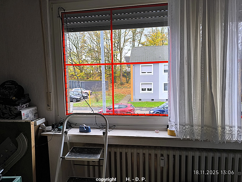 Am Dienstag den 18.11.2025 ging es mit dem Fenster des ehemaligen Kinderzimmer weiter. Zuerst kam das Fensterputzen, dann die Scheiben abkleben und dann ging es mit Lichterketten und den Holzfensterbildern weiter. Auch ein größerer Schwibbogen mit Unterbau fand noch seinen Platz auf der Fensterbank und auch noch ein kleiner Schneewasser Lichterbogen. Auch eine kleine beleuchtete Keramik Kirche fand noch ihren Platz.