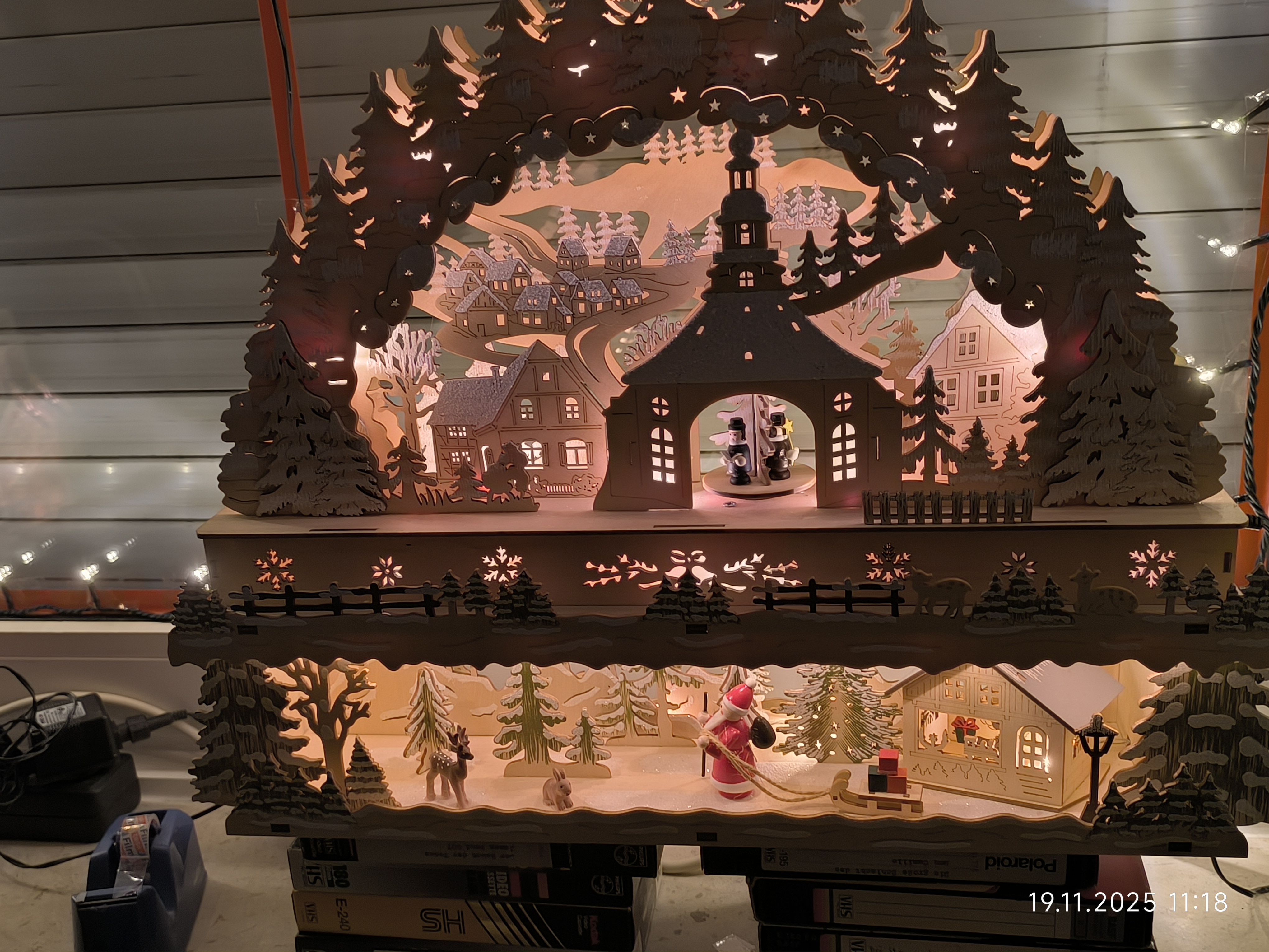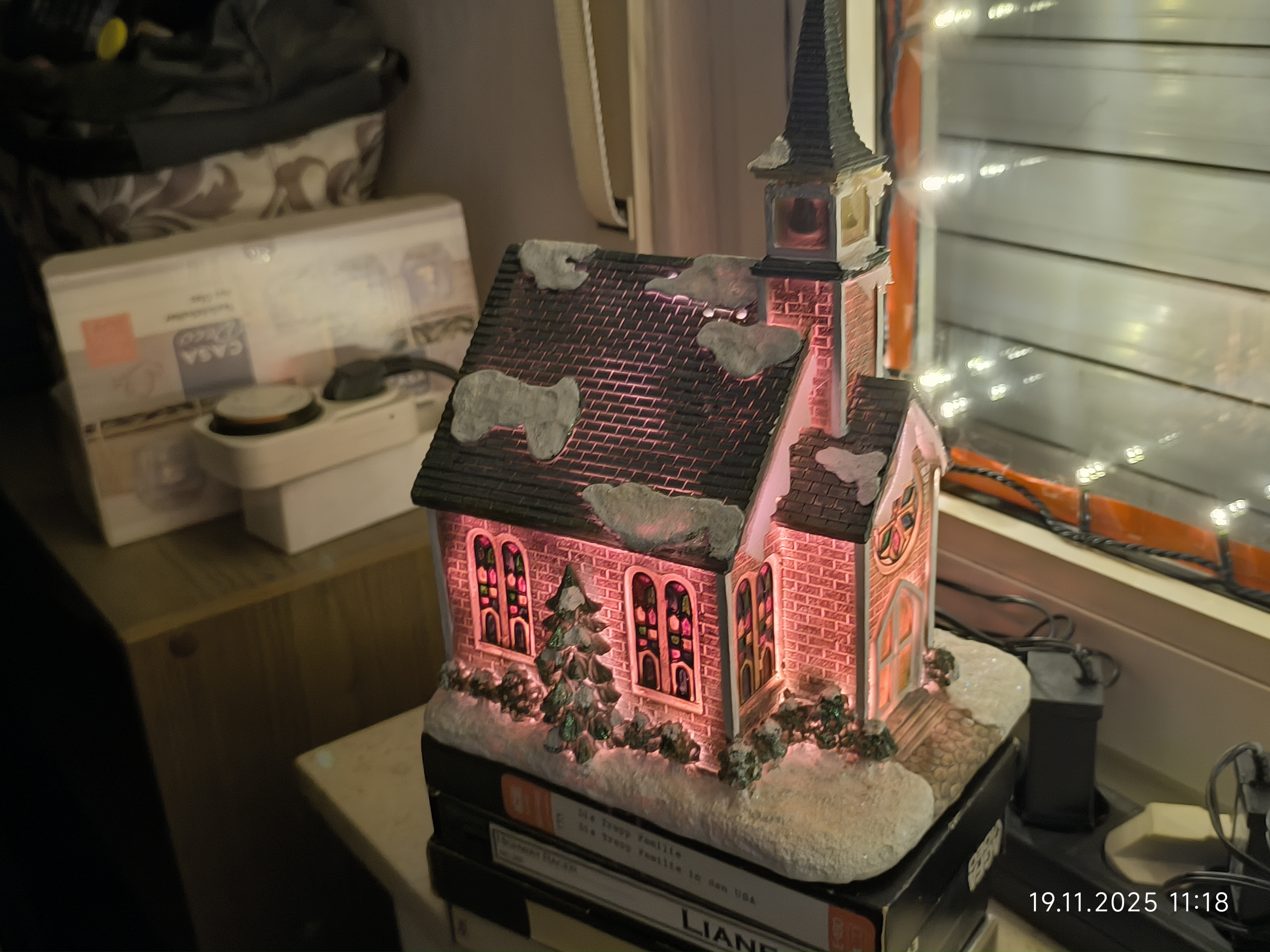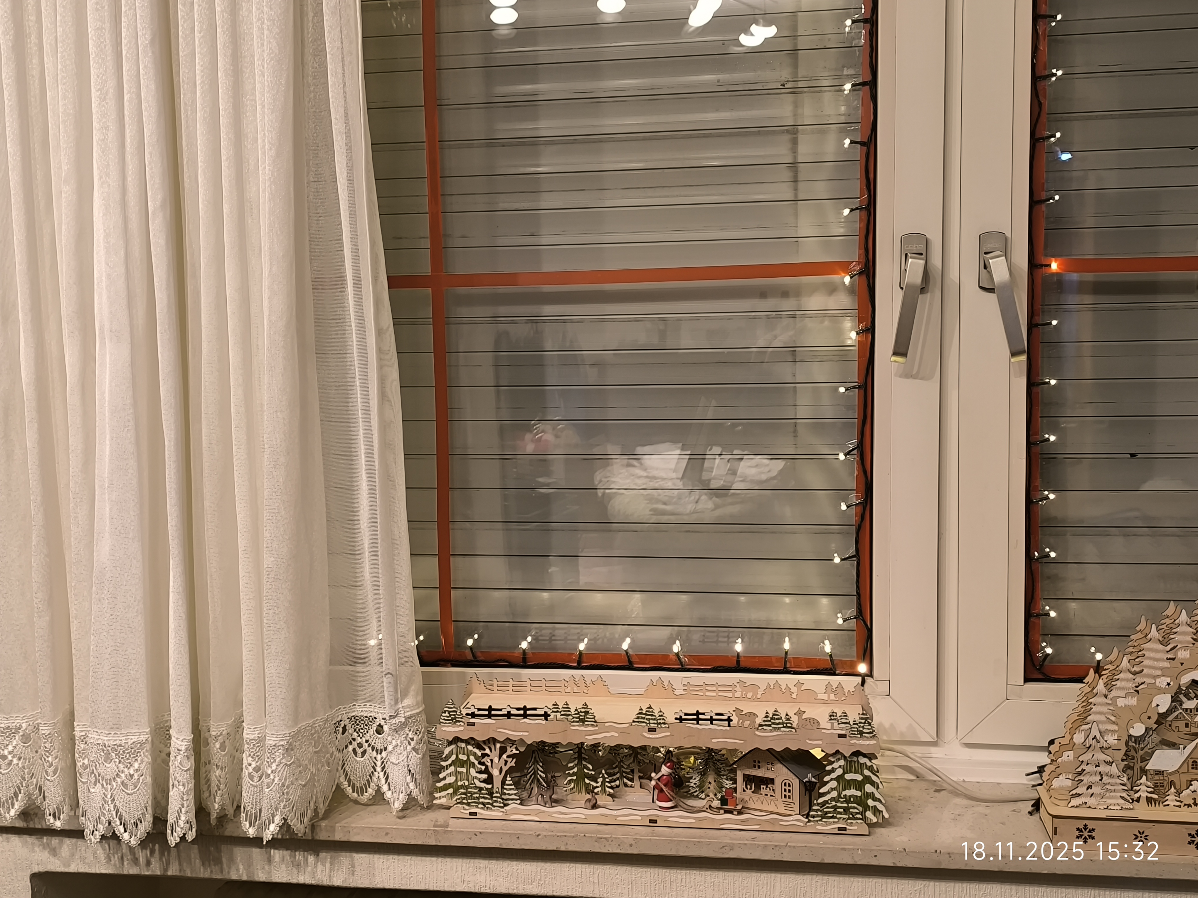 Am Dienstag den 18.11.2025 ging es mit dem Fenster des ehemaligen Kinderzimmer weiter. Zuerst kam das Fensterputzen, dann die Scheiben abkleben und dann ging es mit Lichterketten und den Holzfensterbildern weiter. Auch ein größerer Schwibbogen mit Unterbau fand noch seinen Platz auf der Fensterbank und auch noch ein kleiner Schneewasser Lichterbogen. Auch eine kleine beleuchtete Keramik Kirche fand noch ihren Platz.