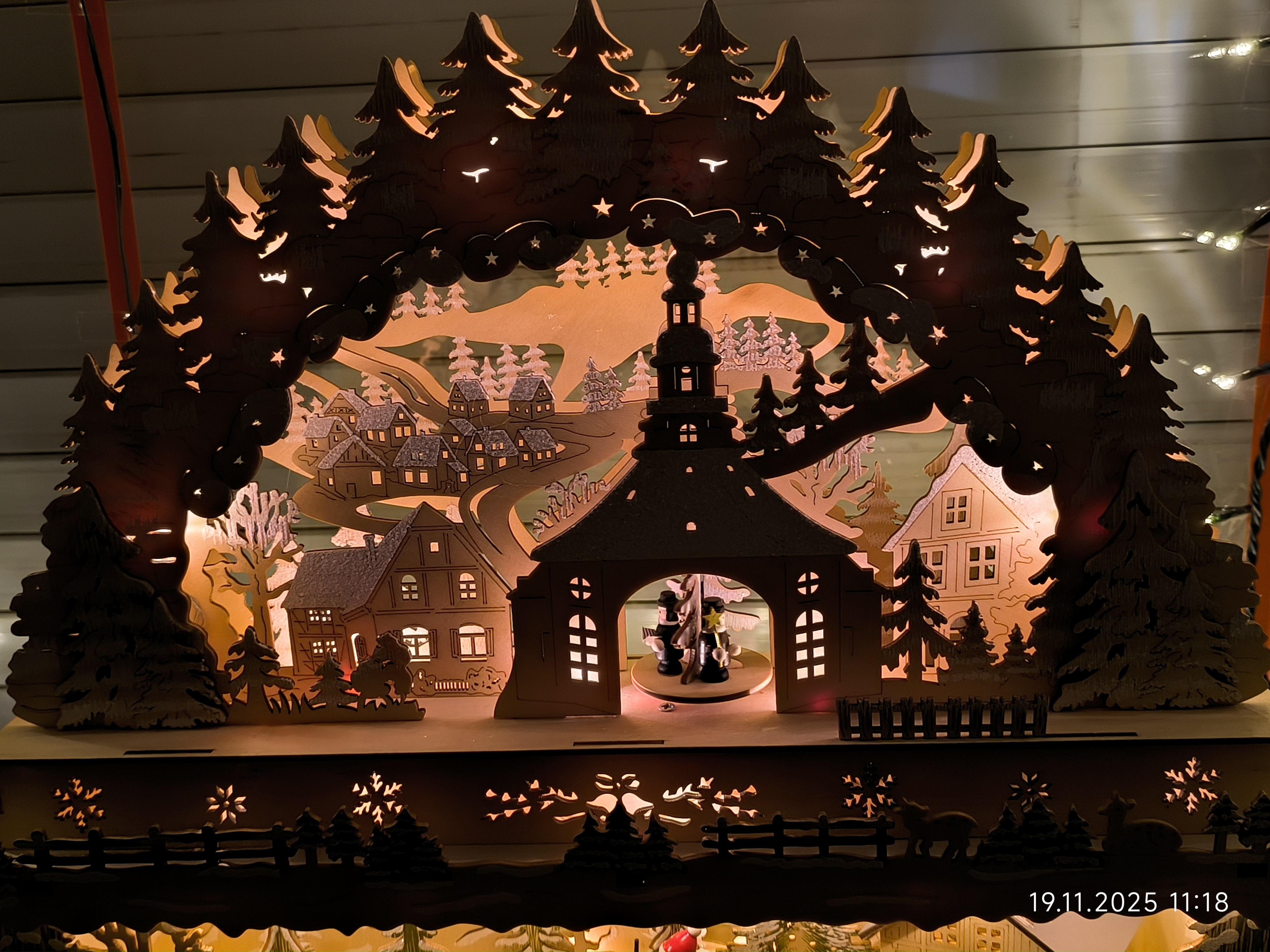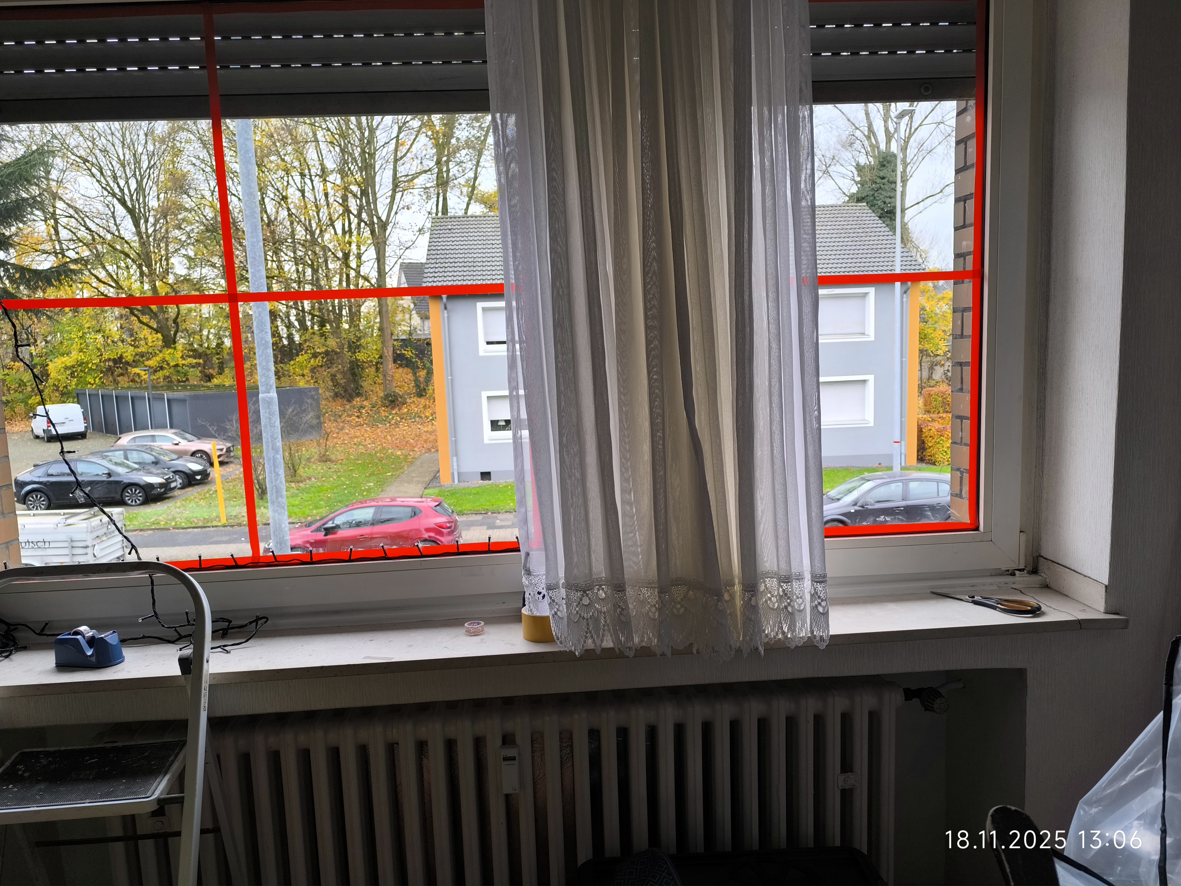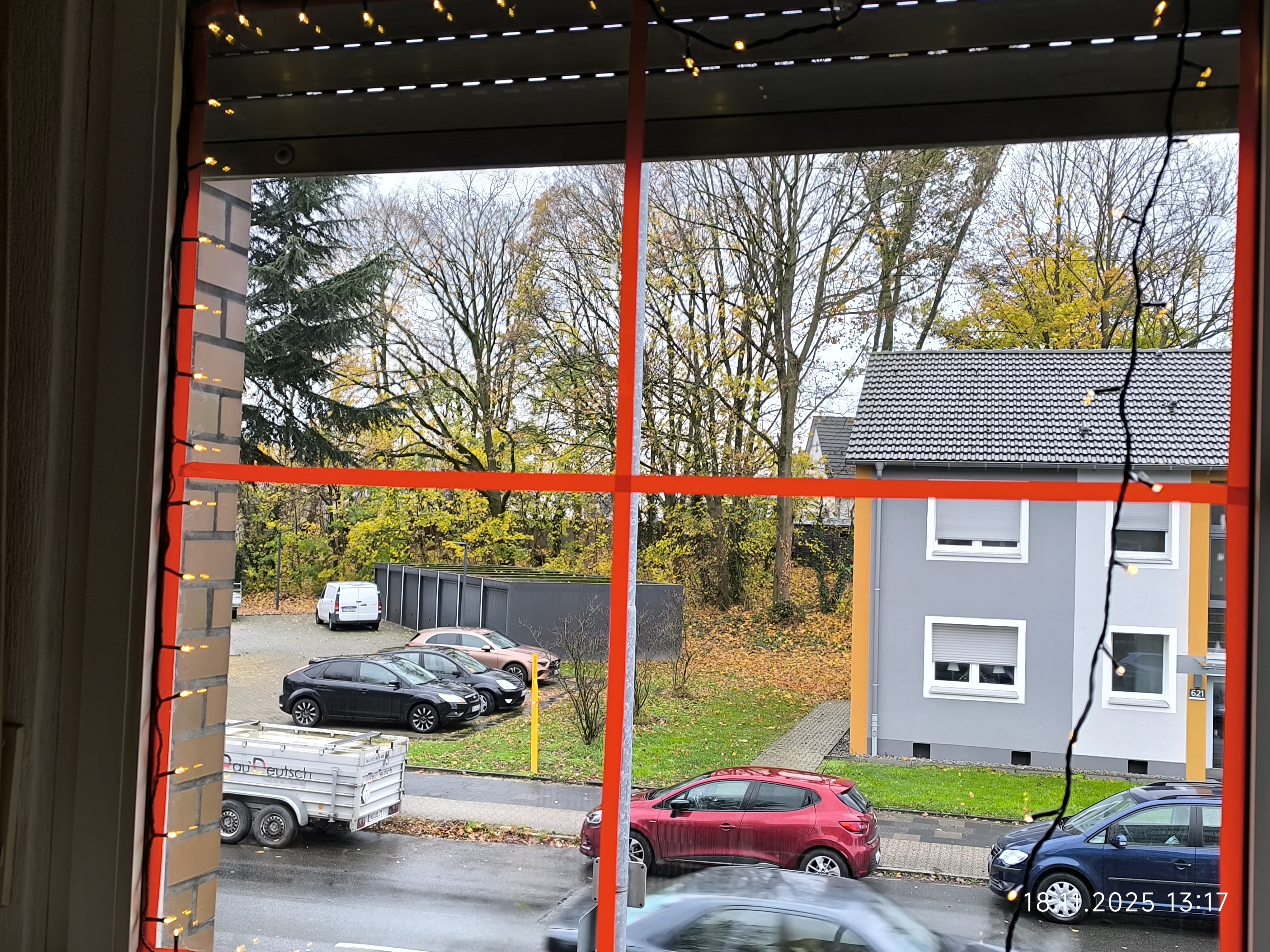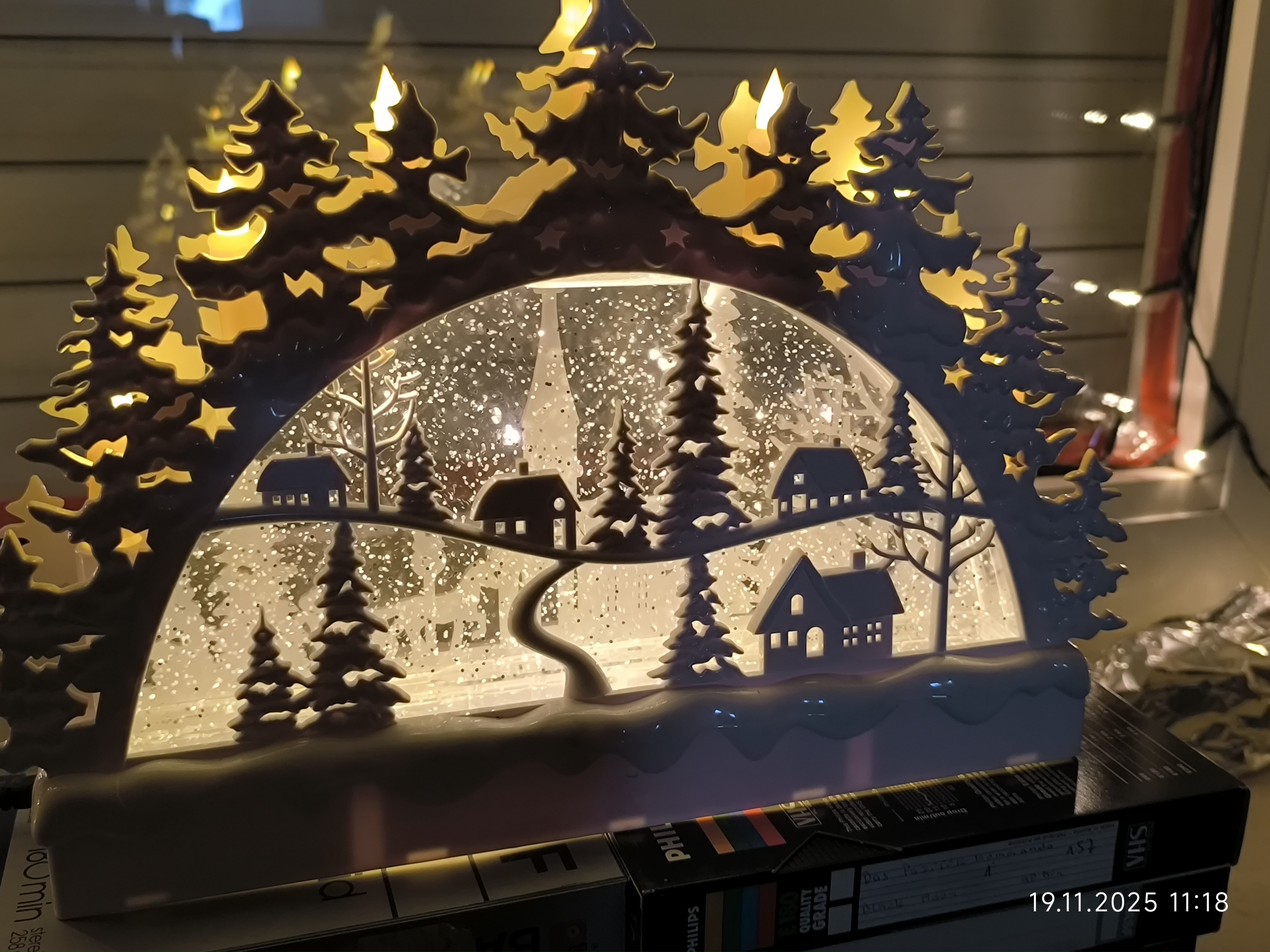 Am Dienstag den 18.11.2025 ging es mit dem Fenster des ehemaligen Kinderzimmer weiter. Zuerst kam das Fensterputzen, dann die Scheiben abkleben und dann ging es mit Lichterketten und den Holzfensterbildern weiter. Auch ein größerer Schwibbogen mit Unterbau fand noch seinen Platz auf der Fensterbank und auch noch ein kleiner Schneewasser Lichterbogen. Auch eine kleine beleuchtete Keramik Kirche fand noch ihren Platz.